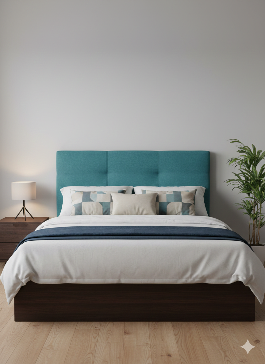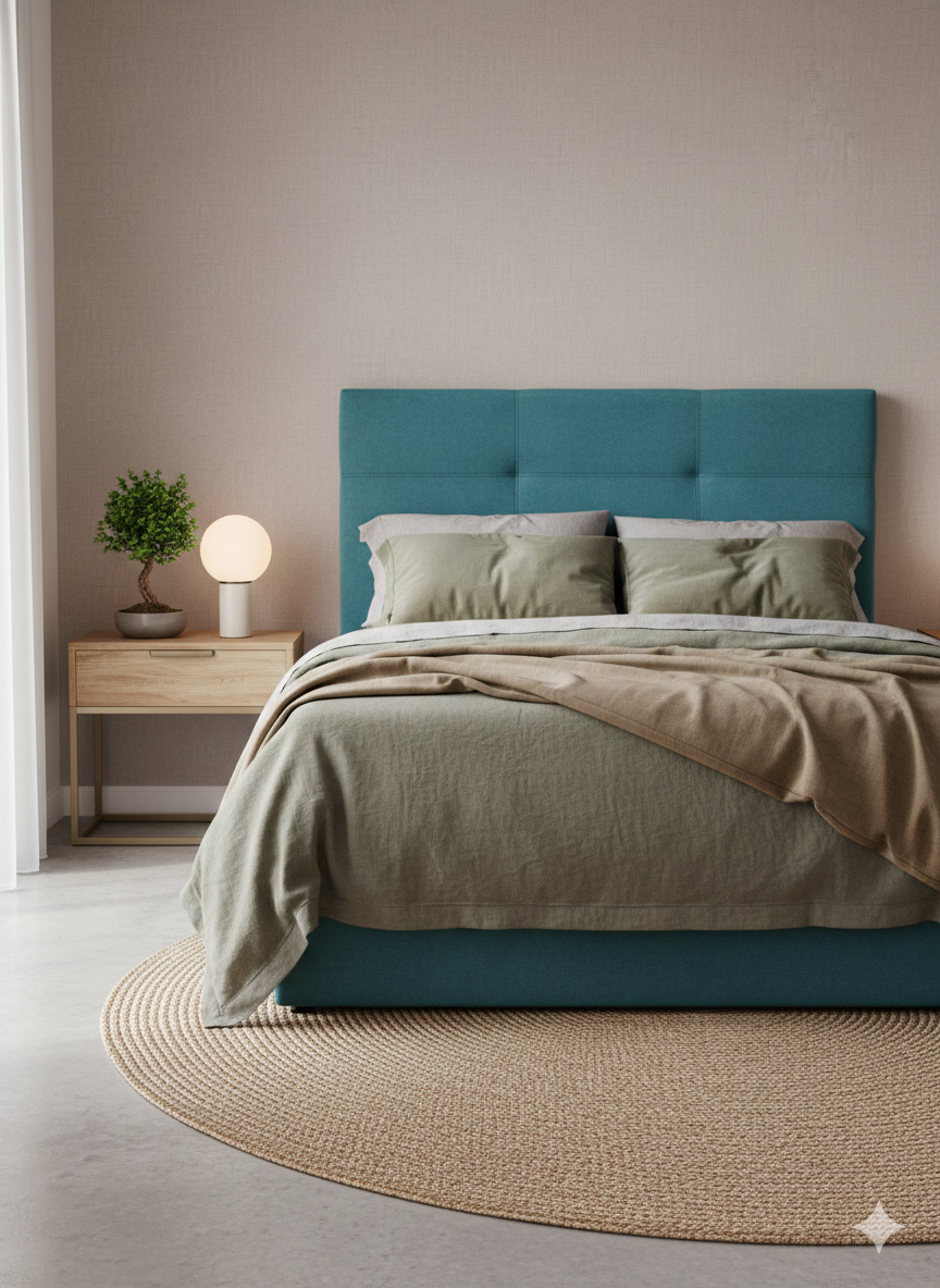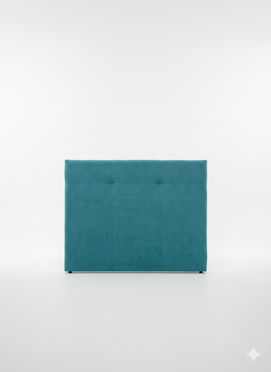 Este cabecero tapizado destaca por su diseño limpio y sofisticado, ideal para dormitorios modernos que buscan equilibrio entre estilo y confort. Su tono verde petróleo aporta profundidad y elegancia, convirtiéndose en el protagonista del dormitorio sin sobrecargar el espacio.